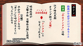 「半ドン」とは「勤務が午前中だけ」であること。 その語源には諸説ありますが、有力といわれているのが、 「半日ドンタク」の略。 江戸時代末期、オランダ語で「日曜」を意味する「zondag(ゾンダーク)」 という言葉が「ドンタク」と、なまって広まり、 明治政府が「土曜半休、日曜休日制」を採用したときに、 半分のドンタクなので「半ドン」と呼ばれるようになったといわれています。