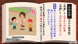 「自業自得」とは、元は仏教用語。 「自業」は「みずからの行為」、「自得」は「みずから受けること」で、 善いことを行えば、善の結果、 悪いことを行えば、悪の結果を得ることになるという意味。 元来は善悪どちらの意味もありますが、 現在では悪い意味で使われることが多くなりました。