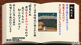 「雨夜の月」とは…雨雲に隠れた月のことで、想像するだけで目には見えないもののたとえ。 |