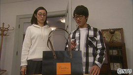 書斎で文之介が高そうなチョコの袋を怪しそうに見つめている。