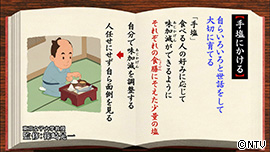 「手塩にかける」とは、 自らいろいろと世話をして大切に育てるという意味。 「手塩」とは、食べる人の好みに応じて味加減ができるように それぞれの食膳にそえた少量の塩のこと。 自分で味加減を調整することから、人任せにせず、 自ら面倒を見るという意味を表すようになりました。