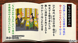 「ちんぷんかんぷん」とは、 人の話している言葉や内容が全くわからないようすのこと。 江戸時代、中国の学問・儒学を研究する儒学者たちが 難しい漢語を多用するのを冷やかして作られた言葉。 「ちんぷんかんぷん」という音は中国語の口まねだといわれています。