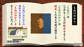 「もぬけのから」の「もぬけ」は、 ヘビやセミなどが脱皮することで、「もぬけのから(殻)」は、 脱皮したあとの抜け殻のこと。 そこから、人の抜け出たあとの寝床や住居のことを 「もぬけのから」と言うようになりました。