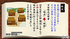 「師走」とは昔の暦(こよみ)で12月を表し、 奈良時代の『日本書紀』にはすでに登場している古い言葉です。 平安時代の辞書には、 「師走」は元々「師馳(しはす)」と書いてあるように、 12月は家々が師を呼んでお経を読んでもらうため、 師が東西に忙しく走り回ることから 「師馳しはす月」とされたという説もあります。