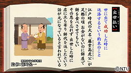 「出世払い」とは、 世に出て成功した時に返済するという約束のこと。 一説によると、江戸時代の大名「藤堂高虎公」が足軽の頃、 お金がないのに餅屋で餅をたらふく食べさせてもらい、 その恩を忘れず、大名に出世した時にわざわざ店に立ち寄り、 餅代を返したという話が元になっているといわれている。