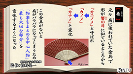 「要」とは、元々、扇(おうぎ)に使われていた金具で、 形がカニの目に似ているところから「カニノメ」と呼ばれ、 「カノメ」「カナメ」と変化していきました。 この金具がないと扇がバラバラになってしまうため、 「物事をまとめる中心人物」や「最も大切な部分」を 意味するようになりました。