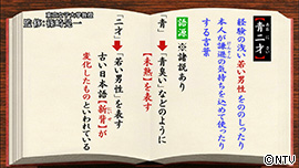 「青二才」とは、経験の浅い若い男性をののしったり、 本人が謙遜の気持ちを込めて使ったりする言葉。 語源には諸説ありますが、 「青」は、「青臭い」などのように「未熟」を表し、 「二才」は、「若い男性」を表す古い日本語「新背(にいせ)」が 変化したものといわれています。