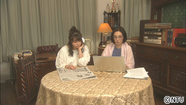 書斎で、いろはが本を読んでいる横で、ことはが新聞を読んでいる。