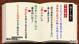「落とし込む」とは今回の場合、 「まとまっていない意見や考えを 具体的な形や行動に反映させる」という意味。 「話や事態などをある所に落ち着かせる」という意味の『落とす』と、「教え込む、使い込む」のように「徹底的に行う」という意味の 『込む』を足して生まれた言葉で、ビジネスの現場などで使われています。