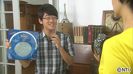 書斎で、いろはと、かるたが防災グッズのチェックをしていると、