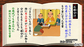 「お裾分け」とは、もらいものや利益を、 さらに他の者に分け与える「裾分け」を丁寧に言った言葉。 「裾」は着物の下の方に位置することから、 「つまらないもの」を表し、特に目上の者が下の者に品物を 分け与えることを「裾分け」と言うようになりました。 そのため、現代でも目上の人には使わない方が無難な言葉です。