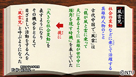 「風雲児」とは、 社会の変動などに乗じて活躍する英雄的人物のこと。 古代中国で「風雲(ふううん)」は、「龍が風と雲に乗って 天に昇るように、英雄が世の中に頭角を現す時機」を 表していました。 後に「大きな社会変動」を表すようになり、 その機会をとらえて目ざましい活動をする人を「風雲児」と 呼ぶようになりました。