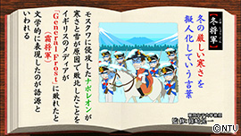 「冬将軍」とは、冬の厳しい寒さを擬人化していう言葉。 モスクワに侵攻したナポレオンが、 寒さと雪が原因で敗北したことを、イギリスのメディアが 「General Frost(霜将軍)」に敗れたと文学的に表現したのが 語源といわれています。