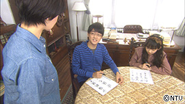 書斎で、文之介、かるたが色紙に文字を書いている そこへ、いろはがやってくる いろは「あら?2人とも何してるの?」 文之介「新学期が始まるから目標を書いてたんだ! 僕は受験生だから…受験勉強を頑張る!」 いろは「おお~、かるたちゃんは?」 かるた「ニューヨークに留学してダンスを勉強する!」 いろは「えー!寝耳に水だね!」