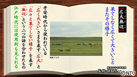 「広大無辺」とは、 果てしなく広くて大きいこと。またその様子。 平安時代から使われている「広く大きい」さまを表す 「広大」と、「広々と果てしない様子」を表す「無辺」という 二つの語を合わせたもの。 江戸時代には使用例も見られます。