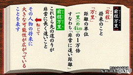 「前程万里」の「前程」は、「将来のこと」。 「万里」は、距離の単位「一里」の1万倍、 すなわち「非常に遠い距離」のこと。 つまり「前程万里」は、 「これから先の道のりが非常に長く遠いこと」。 転じて「その人物の将来に大きな可能性が 広がっていること」を表します。