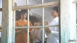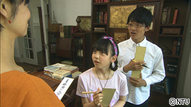 書斎で、いろは、文之介、かるたが 外を見ながら俳句を考えている いろは「よし、できた」 文之介「え!もう?さすが、いろは叔母さん!」 いろは「二人のことを思って詠みました。 青梅雨に 二つの若葉 眩しけり」