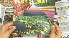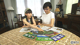 書斎で、いろはと、かるたが旅行のパンフを見ている。