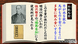 「牛飲馬食」とは、牛が水を飲み、馬がものを食べるように、 |