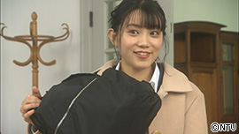 書斎で、いろはが、かるたの髪の毛を結んでいると、