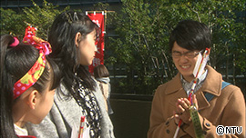 初詣を済ませ、歩いているいろは、ことは、文之介、かるた。