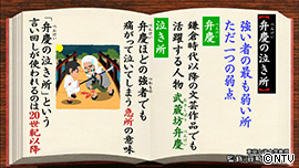 「弁慶の泣き所」とは、「強い者の最も弱い所」「ただ一つの弱点」のこと。 |