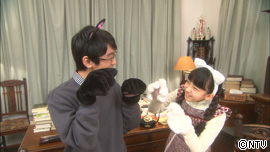 書斎で、文之介と、かるたが猫の鳴き声の練習をしている。