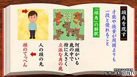 「才能や、技量が周囲よりも一段と優れること」を「頭角を現す」といいます。 この「頭角」は「何頭かいる鹿の中で特に大きく立派な角の鹿」とする説と「人の頭の先」 つまり「頭のてっぺん」と解釈する説があります。
