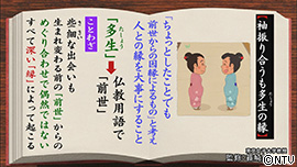 「道で人と袖を触れあうようなちょっとしたことでも、前世からの因縁によるもの」と考え、人との縁を大事にする事を「袖振り合うも多生(たしょう)の縁」といいます。 |