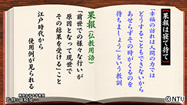 「幸福の訪れは人間の力ではどうすることもできないから、あせらずその時がくるのを待ちましょう」という教訓を「果報は寝て待て」といいます。 |