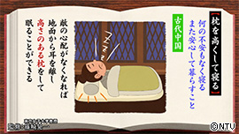 何の不安もなく寝る。また安心して暮らすことを「枕を高くして寝る」と言います。 |