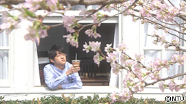 書斎の窓辺からタピオカミルクティーを飲みながら桜を見ている文之介