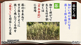 「細い雨が密になり激しく降る様子を「篠(しの)突(つ)く雨」と表現します。 |