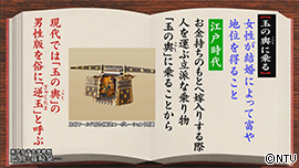 女性が結婚によって富や地位を得ることを「玉の輿(こし)に乗る」といいます。 |