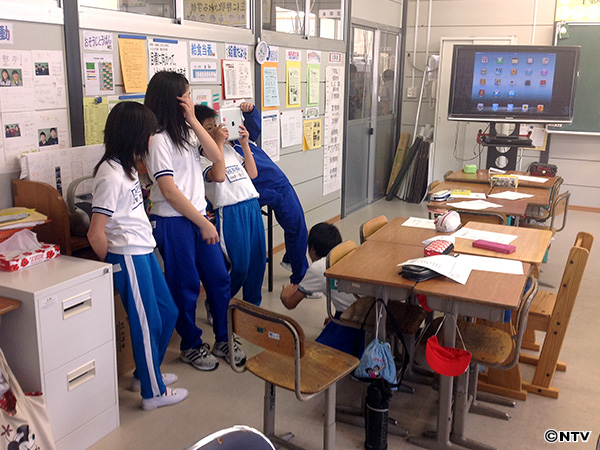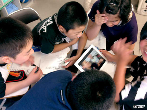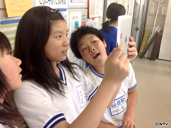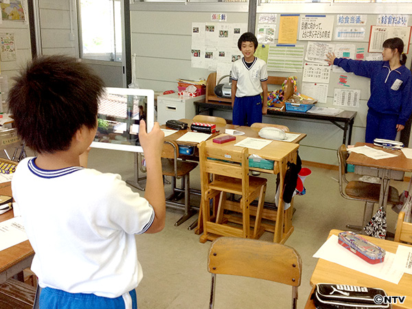 撮影する機材は、タブレット型端末。6年生は全員で40人なのですが、手にし始めるとすぐにお友達を撮影し始め、撮影した映像を見ては、あちらこちらから笑いが起こり、あっという間に使いこなせるようになりました!5人ずつグループに分かれて、学校生活の撮影を開始!!チームをまとめるディレクター役1人、カメラマン役1人、そしてリポーター役3人と役割分担をして、グループごとに話し合った撮影スポットへ!仮設校舎の壁には“磁石がくっ付きます”とリポートしたり、洋式の新しいトイレから学校を紹介したり、体育館でバレーボールをする様子を撮影してみたり・・・。それぞれが思う学校の特徴を記録していたのですが、私たちテレビの仕事をしている大人が発想しない豊かな想像力を感じました!!