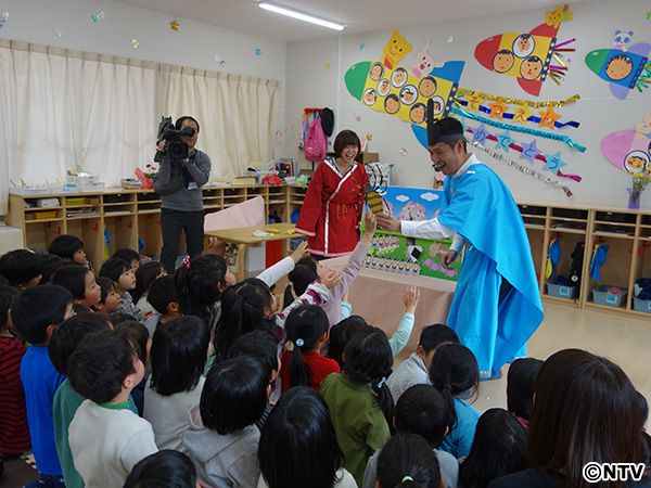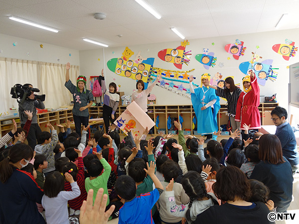 今回はダンス(愛媛バージョン)から始まり「日本語ワークショップ」と絵本の読み聞かせ。さらには愛媛のひなまつり4月3日にあわせて、渡辺裕太さんと南海放送・松岡アナウンサーが二人羽織でお内裏様の格好をして登場しました。
