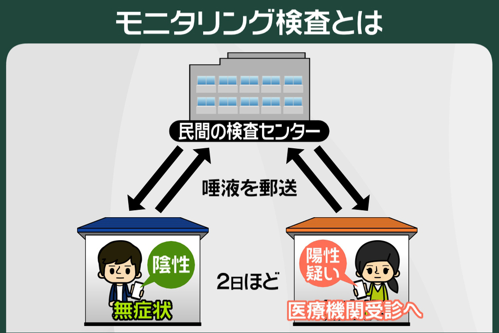 街で検査キットを受けとった人は持ち帰って自宅で唾液を採取し民間の検査センターに郵送。