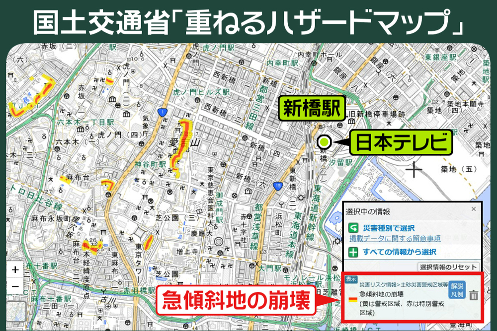 たとえば、この重ねるハザードマップで日本テレビのある新橋周辺に地図を合わせ、
