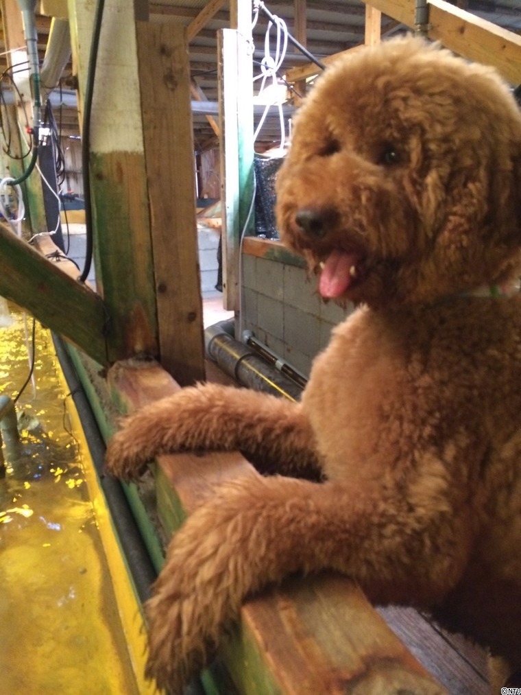 たくさんのヒラメは、おとなしく底のほうにはっている・・・・と思いきや エサをまいたら一斉に水面へ!! ププも僕もビックリしましたー! ププが覗き込んでておもしろかったです!