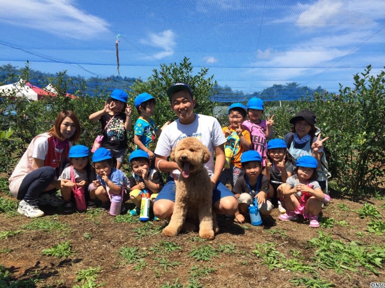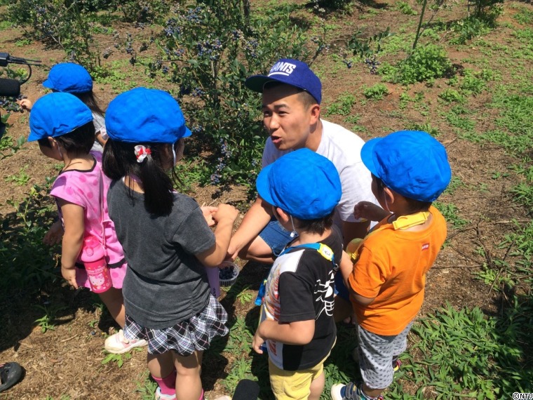 今の季節はブルーベリーがおいしいとの情報をもらい、農園に行ってみると、園内にはブルーベリーの摘みとり体験をしているたくさんの子ども達が!