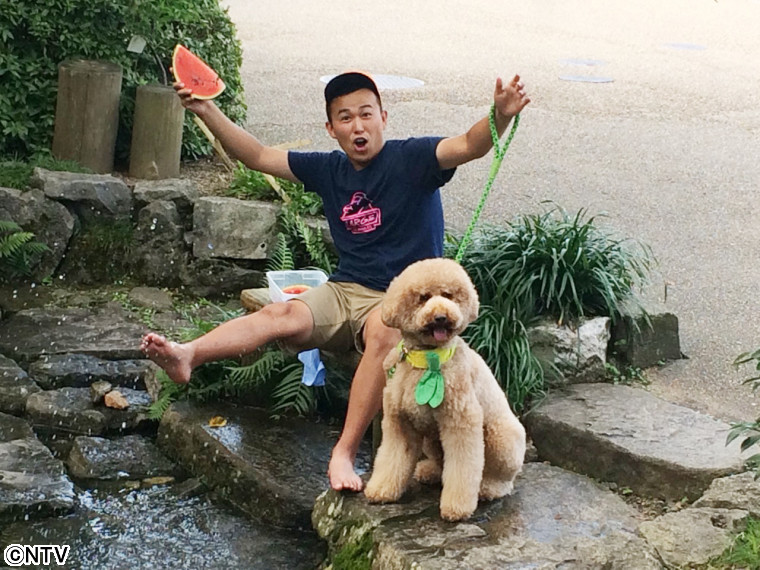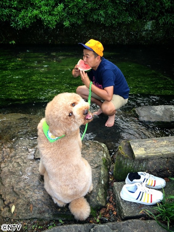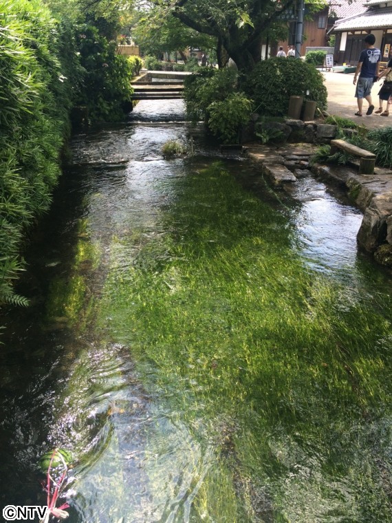 湧き水が有名な場所があると聞いて行ってみると、なんと「湧くわく街道」という風情ある通りがあり、わくわくキャラバンをやってる僕にとってはすごく親近感を感じました! 道沿いには川が流れていて、水中にキレイな花が咲いていたり、暑さを忘れるような涼しさを感じとれました。 ププは湧き水を飲んで、 僕はスイカを食べて、 のんびりと米原の町並みを満喫できました!