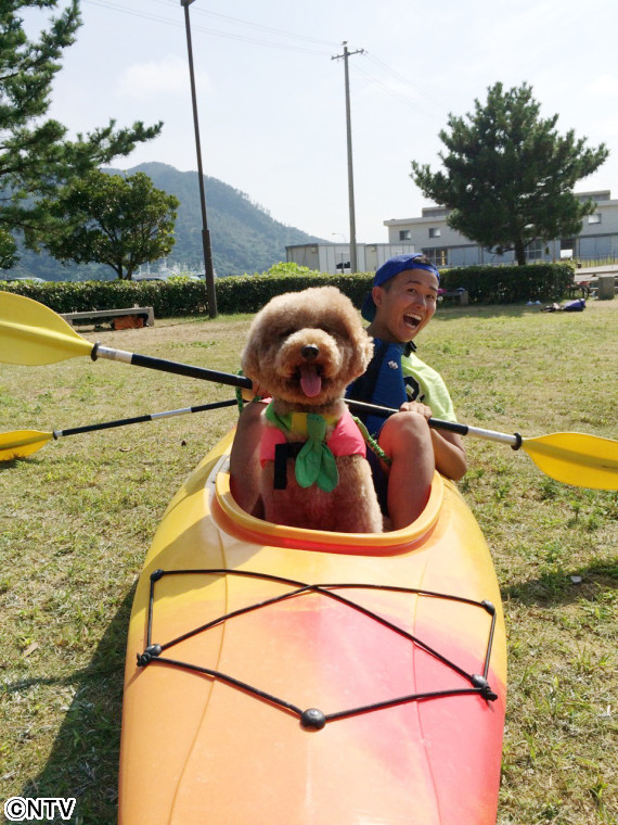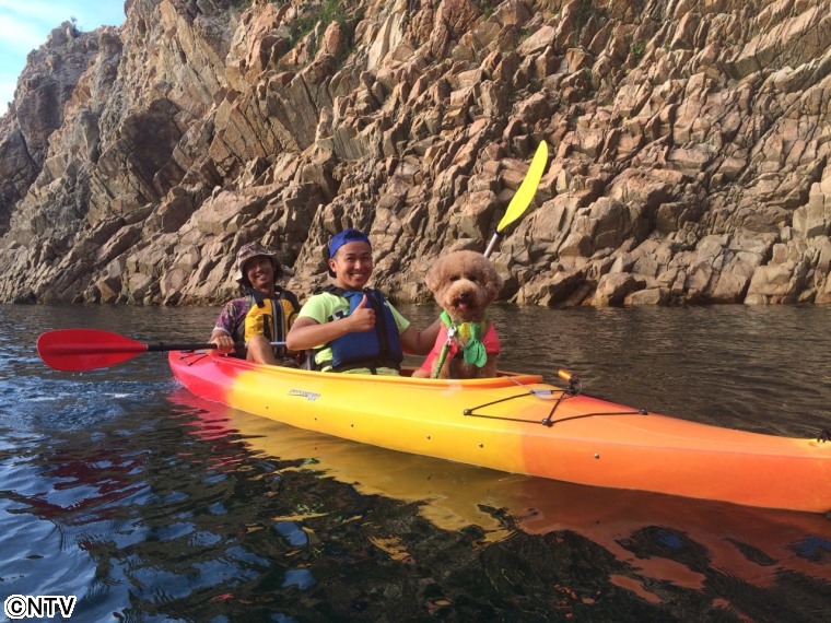 すると、カヤックのインストラクターのお兄さんたちを発見。 ププと一緒に乗せてもらえることになり、久しぶりにカヤックを楽しみました。 洞窟や絶景をププと見ることができて大満足でした。 ププが泳げるようになるのは、いつかなー?