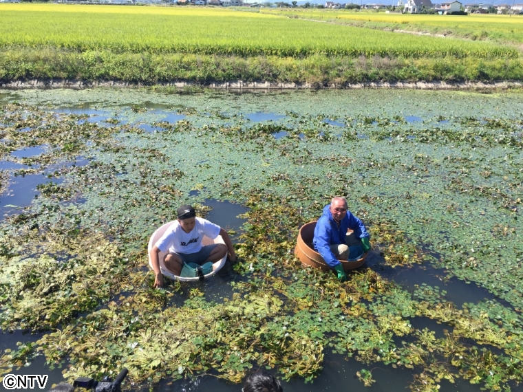 神埼市を訪れました! 街を散策して見つけた、たらい舟に乗って作業している方々。 ヒシの実というものを収穫していました。