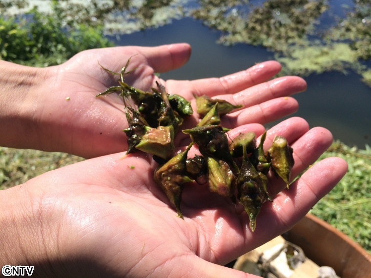 作業を体験させていただいたのですが、バランスをとるのも難しく何度もひっくり返ってしまいました...。 お世話になったお父さんのたらいも巻き込んでしまい、本当に失礼いたしました。 それでも体を張って手に入れたヒシの実! 塩を入れたお湯でゆがくと、栗やそら豆のような食感でとても美味しかったです!