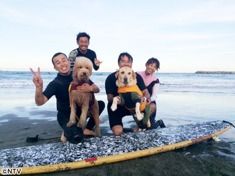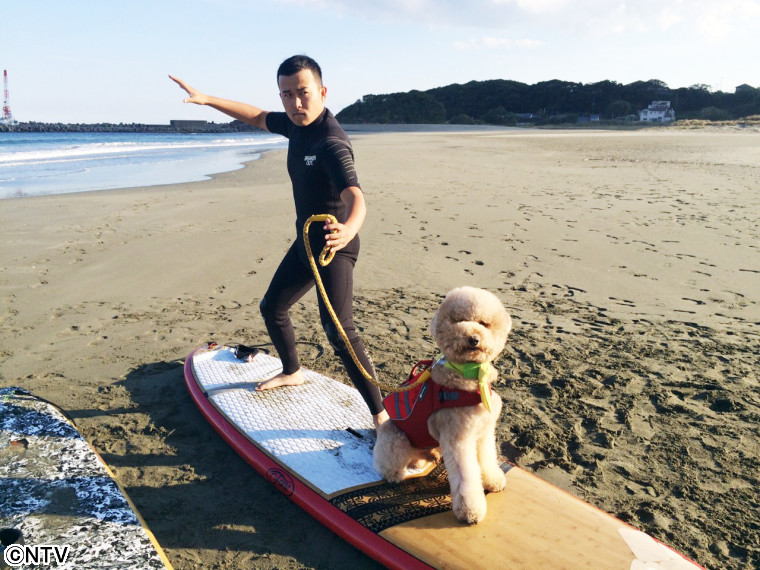 この時期でもサーフィンをしている人がいました!そんな中、犬とサーフィンをしているお父さんを発見!