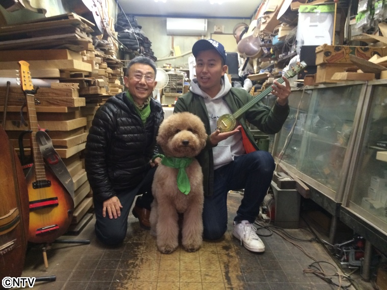 明治大学を訪れた後、商店街をさんぽし、オリジナル楽器を作っているというお店を発見。 明るいご主人と一緒に楽器の演奏しました。