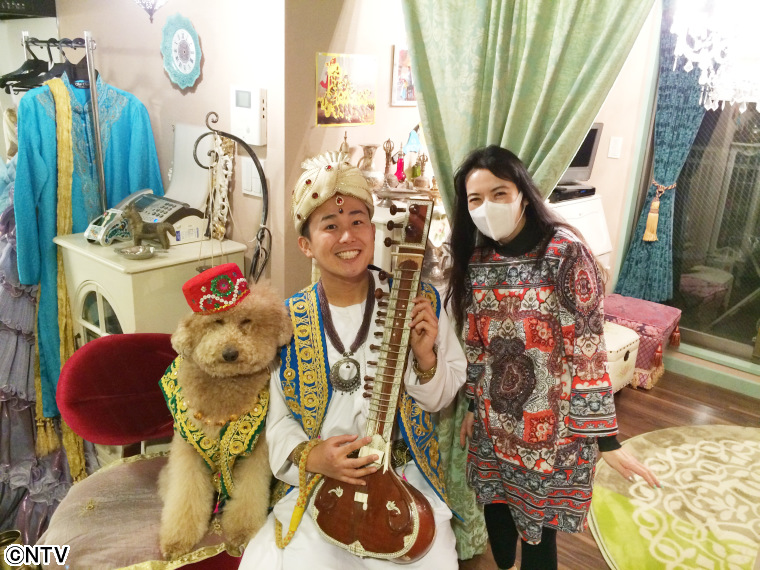 その後、おさんぽしているとジジ!という看板を発見。 これは何かの縁だと思いお邪魔しました。 こちらでは、インド・アラブの民族衣装をレンタルしているそうで、僕とジジも貸してもらいました。 今まで色々な服を着てきましたが、今回のものは今までで1番きらびやかでした。