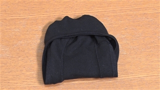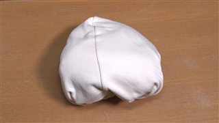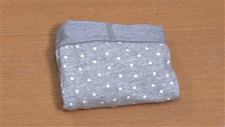 ②ウエスト部分を持ち、中央に向かって1/3折りたたみ、裾をウエストゴムに差し込んで完成!