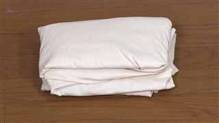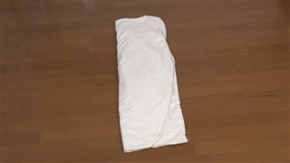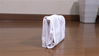 ①裏返しにして、二つに折り重ね、折り重ねた角の部分を裏返し、もう一方の角と合わせて中に入れる。