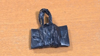 ①持ち手のつけ根の所に向けて、袋を半分に2回折る